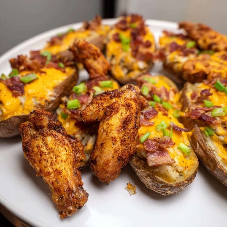 - Arrange wings, potato skins, sausages, and veggie sticks on a large platter. Serve with dips on the side.
