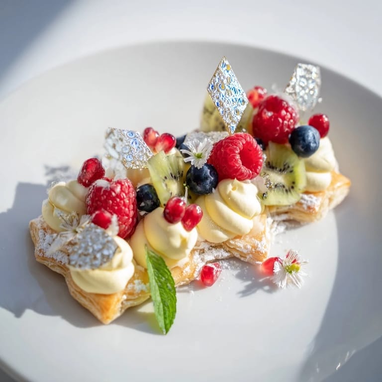 - Arrange mini puff pastry diamonds on a large platter. Pipe or spoon vanilla cream onto some pastries. Add white chocolate diamonds and scatter fruit jewels around. Garnish with edible flowers, mint leaves, and a dusting of powdered sugar.