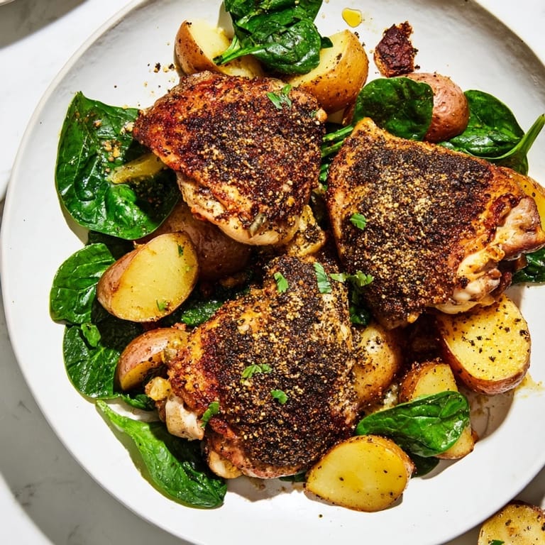 Save A fragrant, one-pan Mediterranean-inspired chicken dish featuring crispy potatoes, wilted greens, and aromatic zaatar seasoning perfect for a flavorful fuss-free weeknight meal.