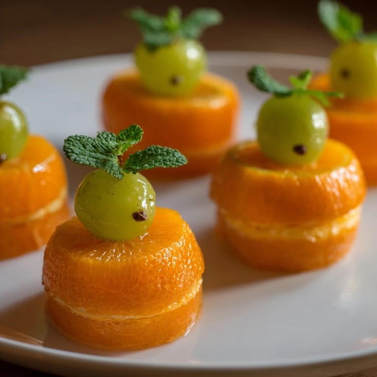 Slice oranges into thick rounds, add grape halves as stems, and use mint leaves along with optional chocolate chips or sesame seeds for decoration.