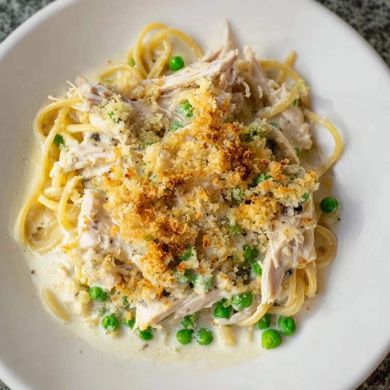 Save I threw this together on a gray Wednesday after finding half a rotisserie chicken in the fridge and a bag of peas I kept meaning to use. The kitchen smelled like butter and garlic within minutes, and by the time the panko turned golden, I had completely forgotten it started as leftovers. My neighbor knocked just as I pulled it from the oven, and I ended up sharing half—she still asks when I'm making "that pasta thing" again.